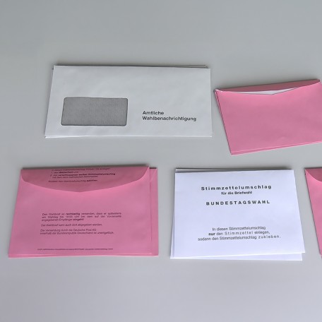 In Torgau-Kuvert produzieren wir verschiedene Arten von Wahlbriefumschlägen: Kuvertierhüllen mit Fenster mit dem Aufdruck "Amtliche Wahlbenachrichtigung", die alle wahlberechtigten Bürgerinnen und Bürger erhalten sowie die weißen und farbigen Stimmzettelumschläge, die zur sicheren Verwahrung der Wahlunterlagen dienen und entweder per Post versendet oder am Wahltag direkt abgegeben werden können.